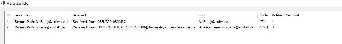 Unter diesem Menüpunkt finden Sie die Liste aller Absender aller bisher empfangenen E-Mails. Die Spalte "Active" enthält den Status der Freigabe der Absender-E-Mail-Adresse.