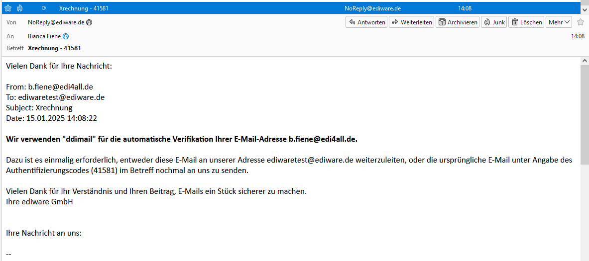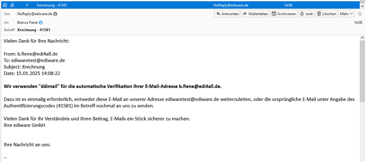 Bei aktivierter Auto-Response-Funktion ist für den Eingang der Nachricht zunächste eine Bestätigung durch den E-Mail-Versender erforderlich. Dazu sendet ddimail BASICS automatisch eine Aufforderung per E-Mail gem. folgendem Beispiel zurück: