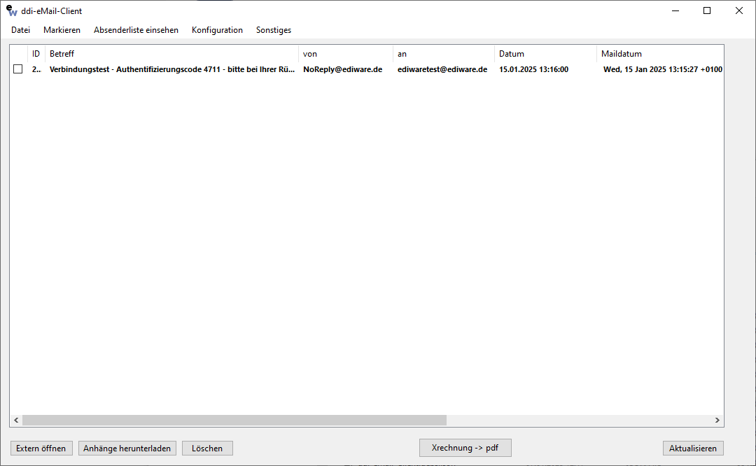 Ab jetzt werden alle eingehenden E-Mails im Hauptfenster von ddimail BASICS aufgeführtet und können per Doppelklick mit dem eigenen E-Mail-Client weiterbe- und verarbeitet werden. Über die Programmoberfläche können außerdem Anhänge nachgeladen, Nachrichten gelöscht und enthaltene E-Rechnungen im PDF-Format lesbar dargestellt werden. Über die Markierungsfunktionen können diese Funktionen für die gewählten Nachrichten gleichzeitig durchgeführt werden.